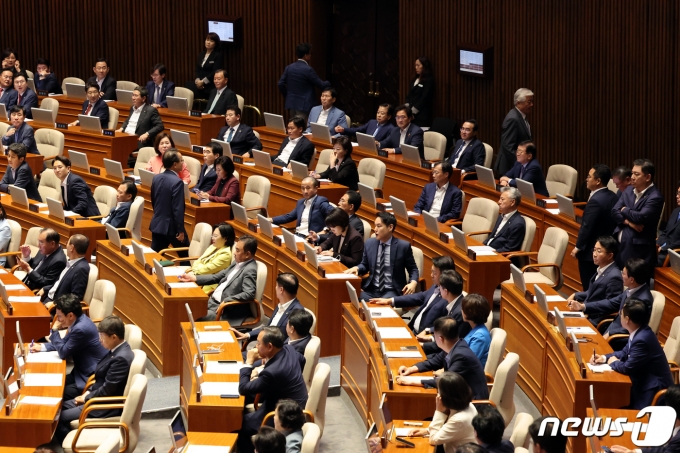 더불어민주당 의원들이 21일 오후 서울 여의도 국회에서 열린 제410회 국회(정기회) 제8차 본회의에서 이재명 대표에 대한 체포동의안이 총투표소 295표, 가 149표, 부 136표, 기권 6표, 무효 4표로 가결되자 아쉬워하고 있다. 2023.9.21/뉴스1 ⓒ News1 황기선 기자