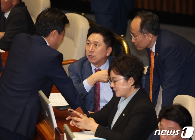 김기현 국민의힘 대표가 21일 오후 서울 여의도 국회에서 열린 제410회 국회(정기회) 제8차 본회의에서 열린 이재명 더불어민주당 대표에 대한 체포동의안 개표에서 의원들과 대화를 하고 있다. 2023.9.21/뉴스1 ⓒ News1 송원영 기자