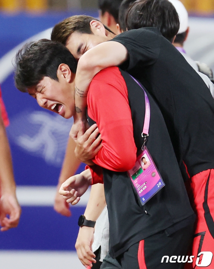 (진화(중국)=뉴스1) 민경석 기자 = 축구 국가대표 이강인(왼쪽)과 송민규가 21일 오후 중국 저장성 진화시 스포츠 센터 스타디움에서 2022 항저우 아시안게임 남자 축구 E조 조별리그 2차전 대한민국과 태국의 경기에서 4 대 0 대승을 거둔 뒤 장난을 치고 있다. 2023.9.21/뉴스1