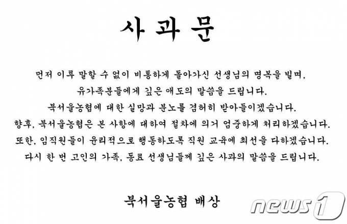 22일 북서울농협 측은 홈페이지를 통해 "이루 말할 수 없이 비통하게 돌아가신 선생님의 명복을 빌며, 유가족분들에게 깊은 애도의 말씀을 드린다"며 "북서울농협에 대한 실망과 분노를 겸허히 받아들이겠다"고 사죄했다.