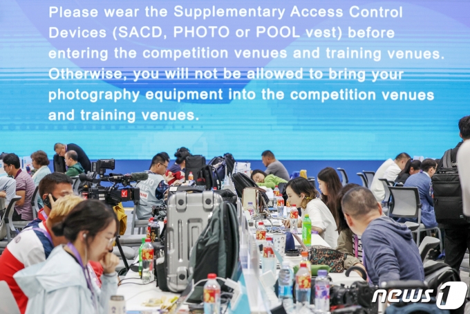 (항저우(중국)=뉴스1) 민경석 기자 = 2022 항저우 아시안게임 개막일인 23일 오후 중국 항저우 엑스포센터에 마련된 메인 미디어센터가 각국 취재진으로 북적이고 있다. 2023.9.23/뉴스1