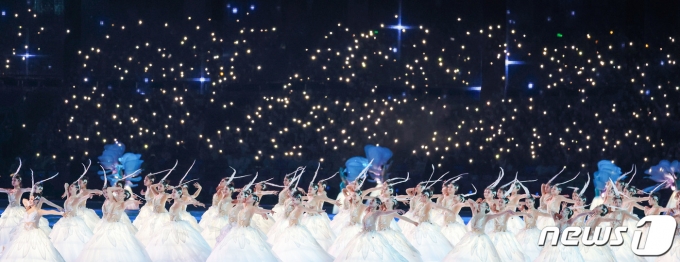 (항저우(중국)=뉴스1) 민경석 기자 = 23일 오후 중국 항저우 올림픽 스포츠센터 스타디움에서 열린 '2022 제19회 항저우 아시안게임' 개회식에서 축하 공연이 펼쳐지고 있다. 2023.9.23/뉴스1