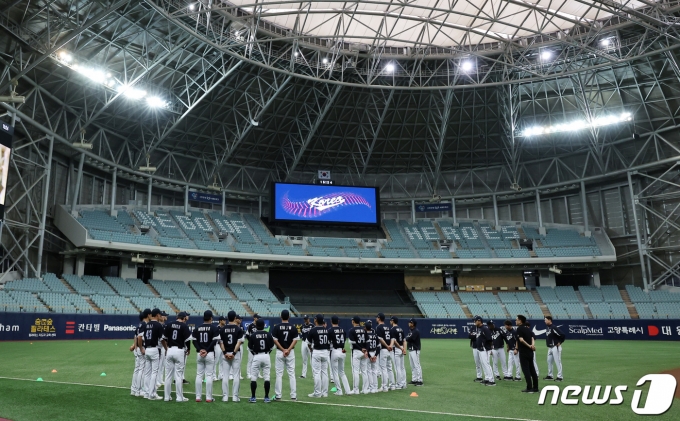 (서울=뉴스1) 김성진 기자 = 항저우 아시안게임 야구대표팀 선수들이 24일 오후 서울 구로구 고척스카이돔에서 열린 공식 훈련에 앞서 회의를 하고 있다. 2023.9.24/뉴스1