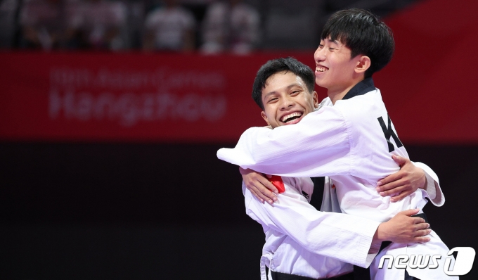 (항저우(중국)=뉴스1) 신웅수 기자 = 24일 오후 중국 항저우 린안 스포츠문화&전시센터에서 열린 2022 항저우 아시안게임 태권도 품새 남자 개인전 결승에서 강완진이 승리를 거둔 후 베트남의 쩐 호 주이와 포옹하고 있다. 2023.9.24/뉴스1