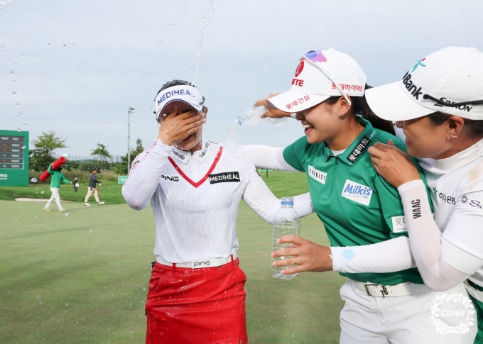 (서울=뉴스1) = 이다연이 24일 인천 청라 베어즈베스트청라CC에서 열린 '하나금융그룹 챔피언십' 최종라운드에서 우승을 차지한 후 동료 선수들에게 물세례를 받고 있다. (KLPGT 제공) 2023.9.24/뉴스1