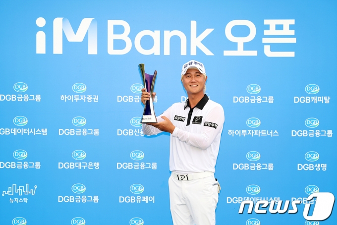 (서울=뉴스1) = 허인회가 24일 경북 파미힐스CC에서 열린 'iM BANK 오픈' 파이널 라운드에서 우승을 차지한 후 트로피를 들고 기념촬영을 하고 있다. (KPGA제공) 2023.9.24/뉴스1