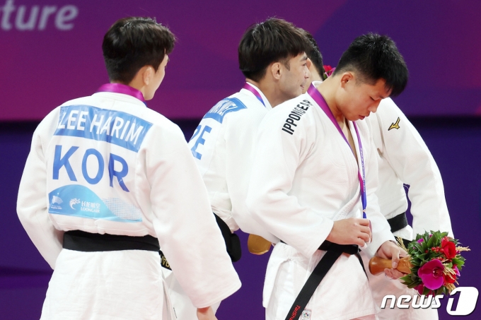(항저우(중국)=뉴스1) 민경석 기자 = 24일 오후 중국 항저우 샤오샨 린푸 체육관에서 열린 2022 항저우 아시안게임 유도 남자 60kg급 경기에서 은메달을 목에 건 대한민국 이하림이 동메달을 차지한 북한 채광진에게 다가가고 있다. 2023.9.24/뉴스1