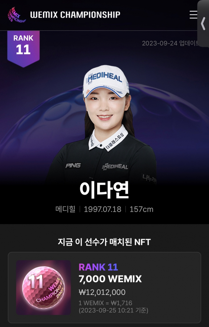 이다연이 위믹스 포인트 랭킹 11위에 자리했다. /사진= 위메이드