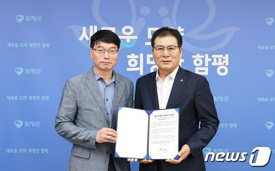 이상익 전남 함평군수(오른쪽)와 장정진 함평군 기획예산실장이 25일 혁신도시특별법 개정을 촉구하는 공동성명서를 발표하고 있다./뉴스1