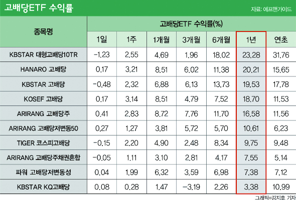 에프앤가이드에 따르면 지난 19일 기준 지난 1년간 20%가 넘는 수익률을 거둔 ETF는 KBSTAR(스타) 대형고배당10TR(토털리턴)(23.28%), HANARO(하나로) 고배당(20.21%)으로 나타났다. KBSTAR 대형고배당10TR은 ▲삼성전자(24.4%) ▲SK하이닉스(20.8%) ▲POSCO홀딩스(12%) ▲현대차(9.6%) ▲LG화학(9.4%) ▲기아(7.7%) ▲KB금융(5.4%) ▲신한지주(4.5%) ▲하나금융지주(3.1%) ▲우리금융지주(2.2%)를 담는다. 주로 배당률이 높은 반도체 기업과 금융지주 종목을 담아 배당률이 높은 수준이다.