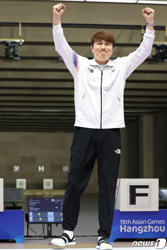 (항저우(중국)=뉴스1) 유승관 기자 = 26일 중국 항저우 푸양 인후 스포츠센터에서 열린 2022 항저우 아시안게임 사격 남자 10m 러닝타깃 혼합 개인 시상식에서 동메달을 획득한 정유진이 시상대에 오르며 관중들을 향해 손을 들어 보이고 있다. 2023.9.26/뉴스1