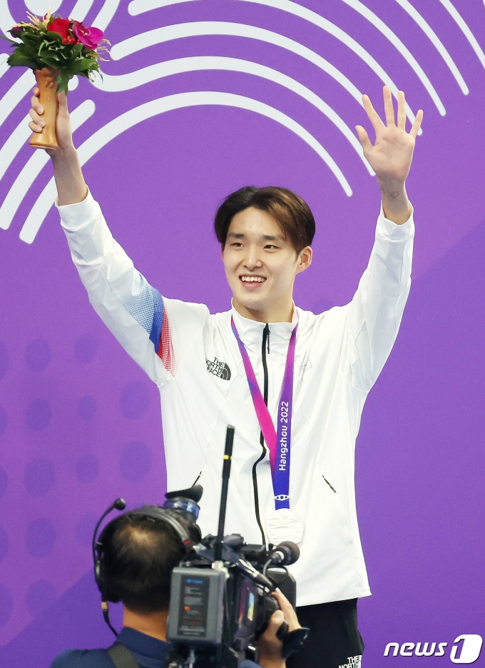 (항저우(중국)=뉴스1) 민경석 기자 = 26일 오후 중국 항저우 올림픽 스포츠센터 수영장에서 열린 2022 항저우 아시안게임 남자 자유형 1,500m 결승전에서 김우민이 2위를 차지해 은메달을 목에 걸은 뒤 기뻐하고 있다. 2023.9.26/뉴스1