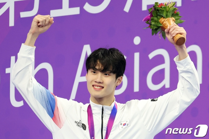 (항저우(중국)=뉴스1) 민경석 기자 = 27일 오후 중국 항저우 올림픽 스포츠센터 수영장에서 열린 2022 항저우 아시안게임 남자 자유형 200m 시상식에서 금메달을 목에 건 대한민국 황선우가 세리머니를 하고 있다. 2023.9.27/뉴스1