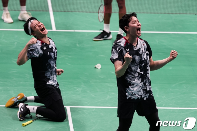 (항저우(중국)=뉴스1) 유승관 기자 = 서승재-강민혁 조가 30일 중국 항저우 빈장체육관에서 열린 2022 항저우 아시안게임 배드민턴 남자 단체전 4강 인도와의 두 번째 경기에서 승리를 거둔 후 포효하고 있다. 2023.9.30/뉴스1