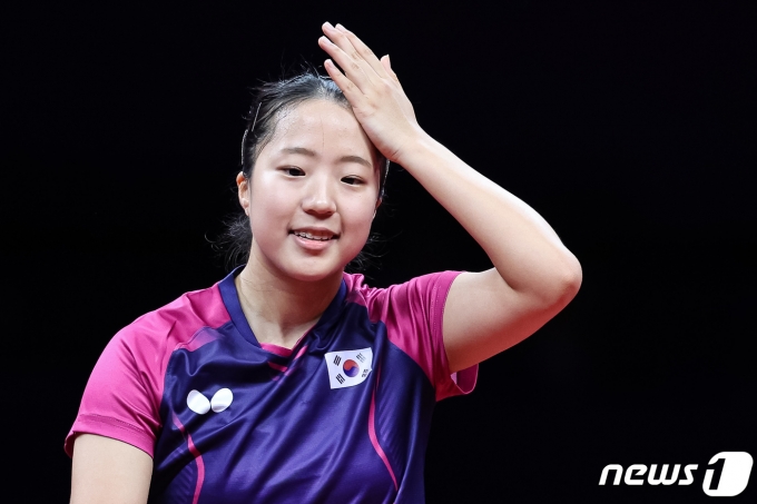 (항저우(중국)=뉴스1) 유승관 기자 = 신유빈이 1일 중국 항저우 궁수 캐널 스포츠파크 체육관에서 열린 2022 항저우 아시안게임 탁구 여자 단식 준결승전 중국 쑨잉샤와의 경기 중 실점을 허용한 후 아쉬워하고 있다.