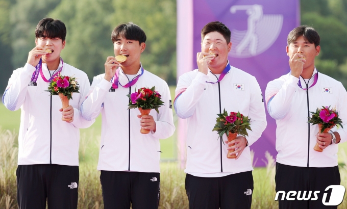 (항저우(중국)=뉴스1) 민경석 기자 = 1일 오후 중국 항저우 서호 국제 골프코스에서 열린 2022 항저우 아시안게임 골프 남자 단체전에서 1위를 차지해 금메달을 목에 건 장유빈(왼쪽부터)과 조우영, 임성재, 김시우가 포즈를 취하고 있다. 2023.10.1/뉴스1