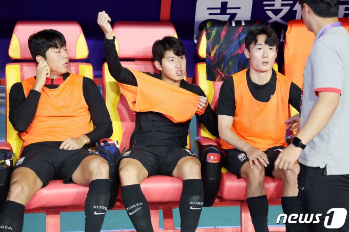 (항저우(중국)=뉴스1) 민경석 기자 = 1일 오후 중국 항저우 황룽 스포츠센터 스타디움에서 열린 2022 항저우 아시안게임 대한민국과 중국의 축구 8강전에서 대한민국 이강인이 선발 명단에서 제외돼 벤치에 앉아 동료들과 대화를 나누고 있다. 2023.10.1/뉴스1