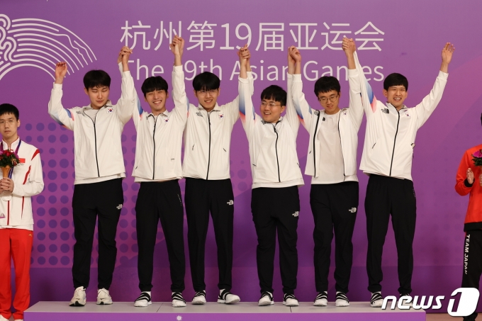 (항저우(중국)=뉴스1) 유승관 기자 = 남자 바둑 대표팀 김명훈, 박정환, 변상일, 신민준, 신진서, 이지현 9단이 중국 항저우 치위안 체스홀에서 열린 2022 항저우 아시안게임 바둑 남자 단체전 시상식에서 두 팔을 들어올리고 있다. 2023.10.3/뉴스1