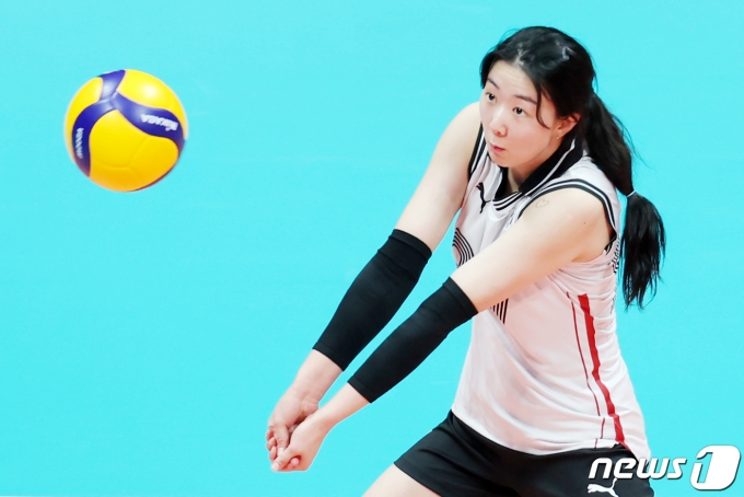 5일 오후 중국 항저우 사범대학 창첸캠퍼스 체육관에서 열린 2022 항저우 아시안게임 여자 배구 8강 라운드 E조 대한민국과 북한의 경기에서 대한민국 강소휘가 리시브에 성공하고 있다. 2023.10.5/뉴스1 ⓒ News1 민경석 기자