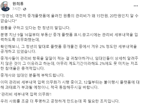 원희룡 국토교통부 장관이 공인중개사·임대인의 관리비 세부내역 공개 현황에 대해 사회관계망서비스(SNS)를 통해 지적했다. 원 장관은 지난 13일 본인의 페이스북을 통해 "지난 9월16일부터 부동산 플랫폼의 표시·광고 시 관리비 세부내역을 입력하도록 의무화했는데, 확인해보니 플랫폼 중개 물건 중 겨우 2% 정도만 세부내역을 공개하고 있다"고 지적했다.