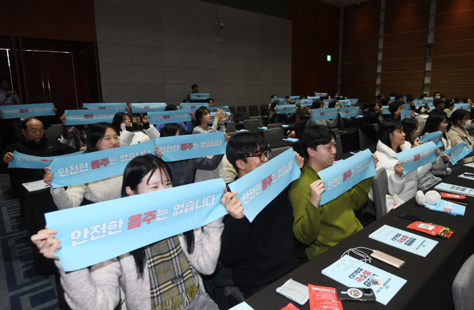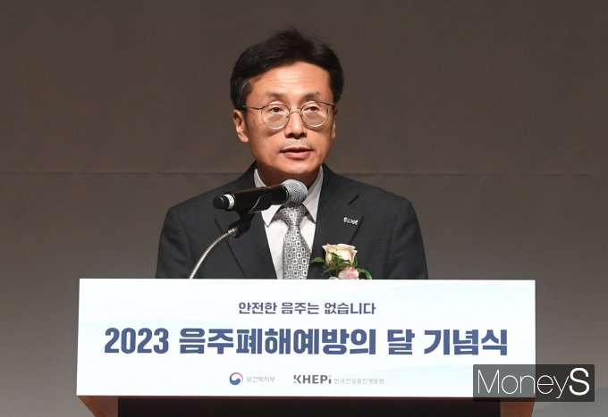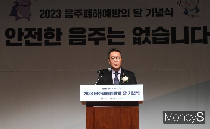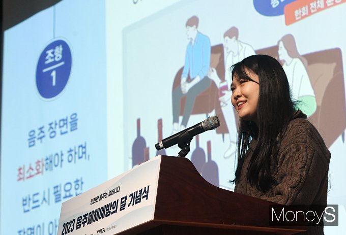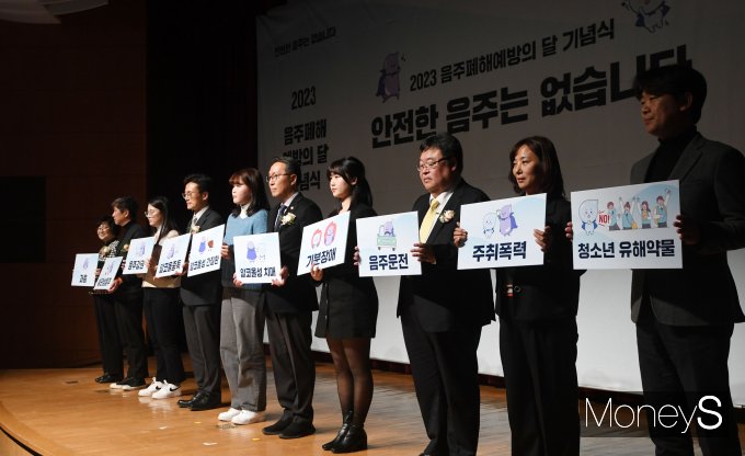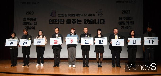 30일 오후 서울 용산구 백범김구기념관에서 열린 2023 음주폐해예방의 달 기념식에서 참석자들이 '안전한 음주는 없습니다' 기념 세리머니를 펼치고 있다.