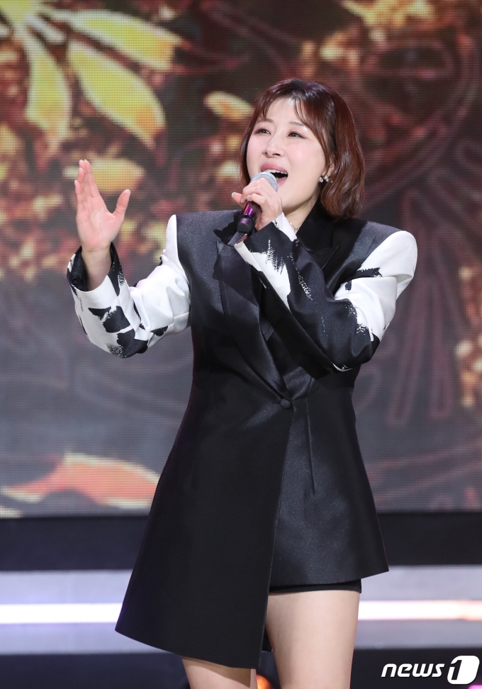 (서울=뉴스1) 권현진 기자 = 가수 이미리가 4일 오후 서울 마포구 상암동 SBS 프리즘 타워에서 열린 SBS FiL, SBS M ‘더 트롯쇼’에서 '돌팔매'를 선보이고 있다. 2023.12.4/뉴스1