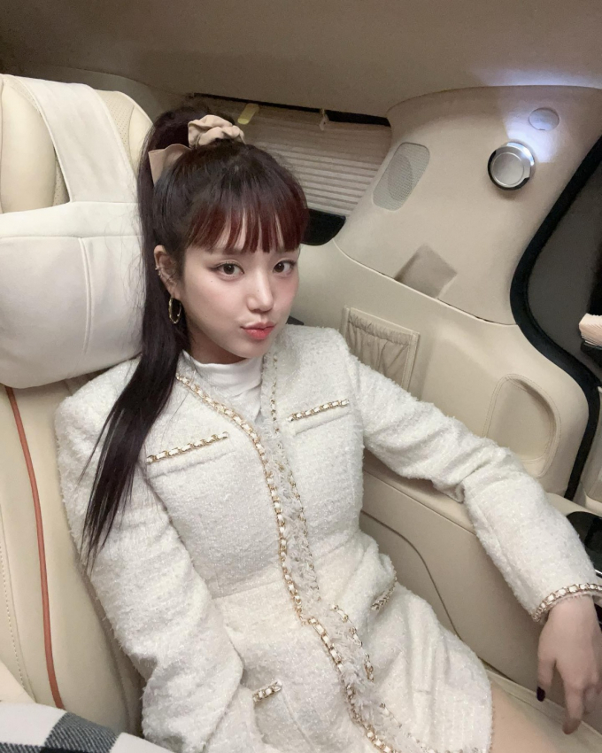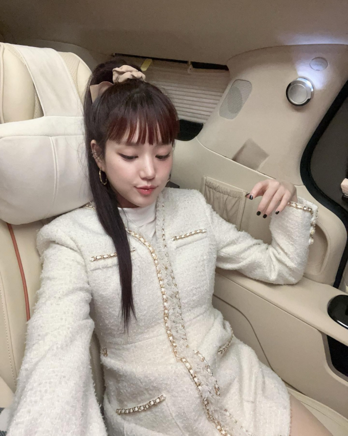 이유비는 터틀넥 티셔츠에 골드 체인 포인트의 아이보리 컬러 트위드 원피스를 입고, 높게 올려 묶은 포니테일 헤어로 상큼하면서도 럭셔리한 룩을 완성했다.