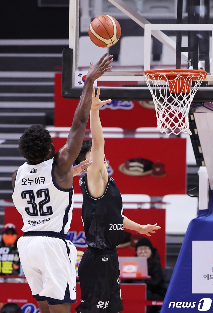 (수원=뉴스1) 이재명 기자 = 5일 오후 경기 수원시 권선구 수원KT소닉붐아레나에서 열린 '2023-2024 정관장 프로농구' 수원 KT 소닉붐과 고양 소노 스카이거너스의 경기에서 소노 오누아쿠가 슛을 시도하고 있다. 2023.12.5/뉴스1
