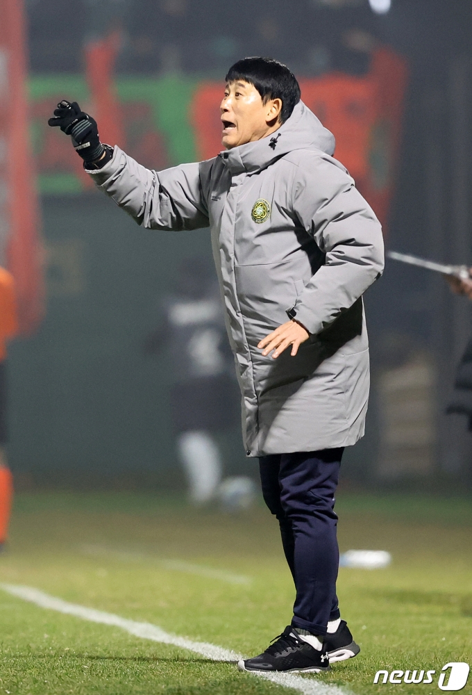 (김포=뉴스1) 김진환 기자 = 6일 오후 경기 김포 솔터축구장에서 열린 하나원큐 K리그 승강 플레이오프 1차전 김포FC와 강원FC의 경기, 고정운 김포FC 감독이 선수들에게 작전을 지시하고 있다. 2023.12.6/뉴스1