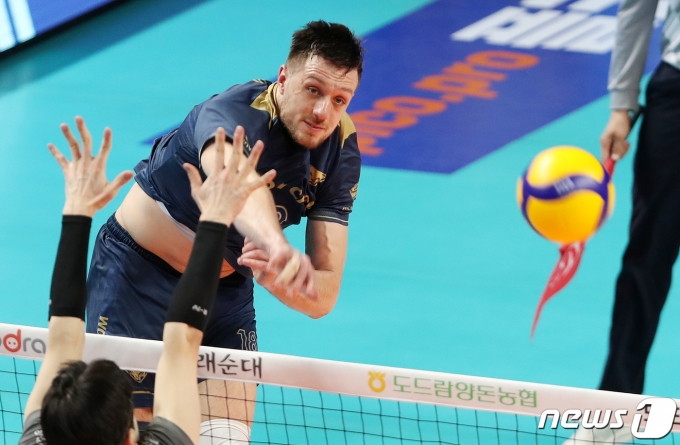(서울=뉴스1) 이승배 기자 = 7일 서울 중구 장충체육관에서 열린 남자 프로배구 '2023-2024 도드람 V리그' 우리카드와 대한항공의 경기에서 우리카드 마테이가 공격하고 있다. 2023.12.7/뉴스1