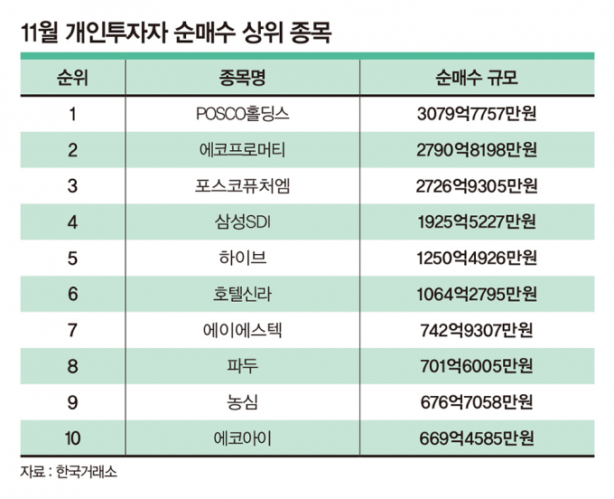한국거래소에 따르면 개인투자자들의 지난달 순매수 상위 10개 종목 가운데 절반은 2차전지 관련주가 차지했다. 1~2위는 포스코그룹주로 나타났다. 개인들은 POSCO홀딩스와 포스코퓨처엠을 각각 2916억원, 2806억원 규모로 사들였다.