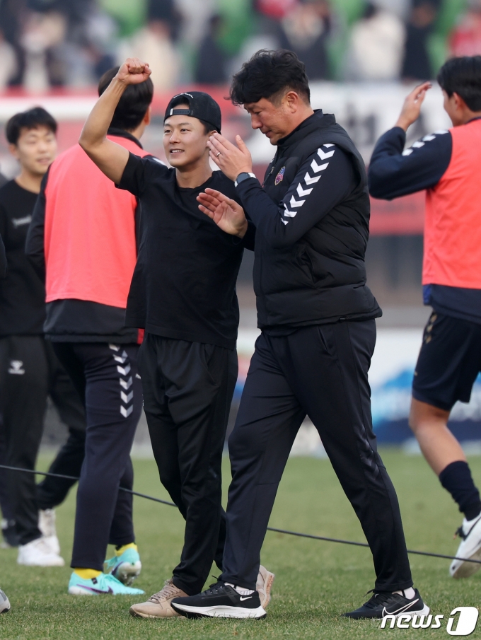 (수원=뉴스1) 김성진 기자 = 수원FC 이승우와 김도균 감독이 9일 경기 수원종합운동장에서 열린 하나원큐 K리그 승강 플레이오프 2차전 수원FC와 부산 아이파크의 경기에서 5-2로 승리하며 잔류에 성공하자 기뻐하고 있다. 2023.12.9/뉴스1