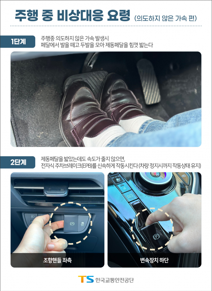 공단은 EPB가 장착된 국내 판매 차종(가솔린, 디젤, 하이브리드, 전기차)을 대상으로 주행 및 제동 시험을 실시한 결과 주행 중 의도하지 않은 가속이 발생한 경우 제동페달을 작동시키는 방법과 EPB를 지속적으로 작동하는 방법이 가장 효과적이라고 밝혔다.