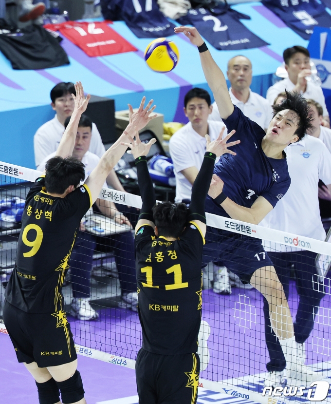 (인천=뉴스1) 이재명 기자 = 10일 오후 인천 계양체육관에서 열린 남자 프로배구 '2023-2024 도드람 V리그' 대한항공 점보스와 KB손해보험 스타즈의 경기에서 대한항공 임동혁이 공격을 하고 있다. 2023.12.10/뉴스1