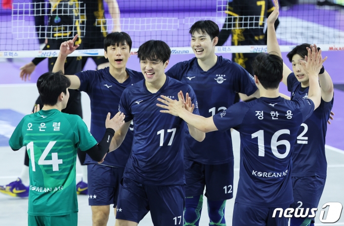 (인천=뉴스1) 이재명 기자 = 10일 오후 인천 계양체육관에서 열린 남자 프로배구 '2023-2024 도드람 V리그' 대한항공 점보스와 KB손해보험 스타즈의 경기에서 득점에 성공한 대한항공 임동혁(17번)이 동료 선수들의 축하를 받고 있다. 2023.12.10/뉴스1