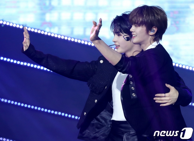 (서울=뉴스1) 권현진 기자 = 제로베이스원 성한빈과 김규빈(오른쪽)이 10일 오후 서울 송파구 잠실실내체육관에서 열린 ‘2023 케이 링크 페스티벌(2023 K-link 페스티벌)’에서 멋진 무대를 선보이고 있다. 2023.12.10/뉴스1