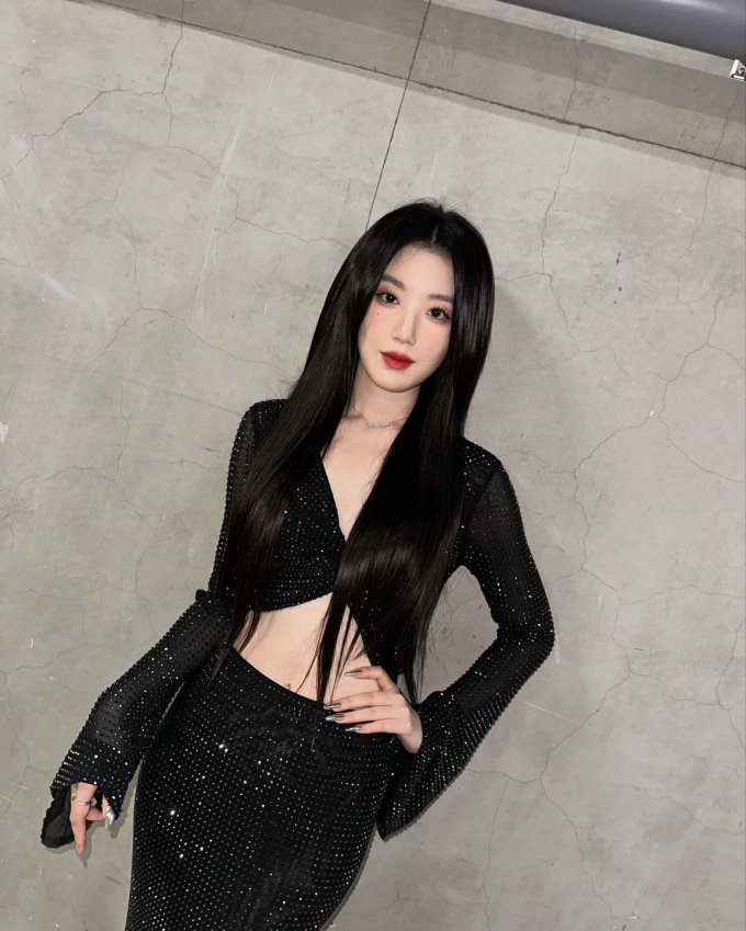 그녀는 검은 긴 생머리에 붉은 립 메이크업을 더해 매혹적인 자태를 뽐냈으며, 특히 희고 가녀린 개미 허리가 시선을 사로잡았다.