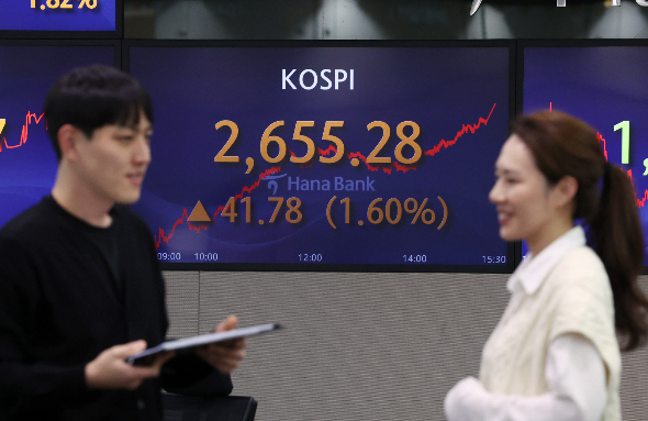 코스피가 전 거래일(2613.50)보다 41.78포인트(1.60%) 오른 2655.28에 장을 마친 28일 서울 중구 하나은행 딜링룸에서 딜러들이 업무를 보고 있다. /사진=뉴시스