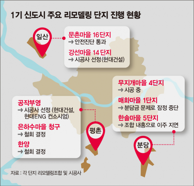부진했던 1기 신도시 재건축이 급물살을 타면서 리모델링 추진 단지들은 대거 혼란에 빠졌다. 평촌 은하수마을 청구, 샘마을대우, 한양 등이 리모델링 철회를 결정했다. 2022년과 2023년 각각 포스코이앤씨, 현대건설로 시공사 선정을 마친 일산 문촌마을 16단지와 강선마을 14단지 등도 일부 소유주가 리모델링 대신 재건축을 추진해야 한다는 목소리를 높이고 있다. 후곡마을 11·12단지도 재건축을 원하는 이들과의 다툼으로 리모델링 조합 설립에 대한 소유주 동의가 원활히 진행되지 못하는 상태다.