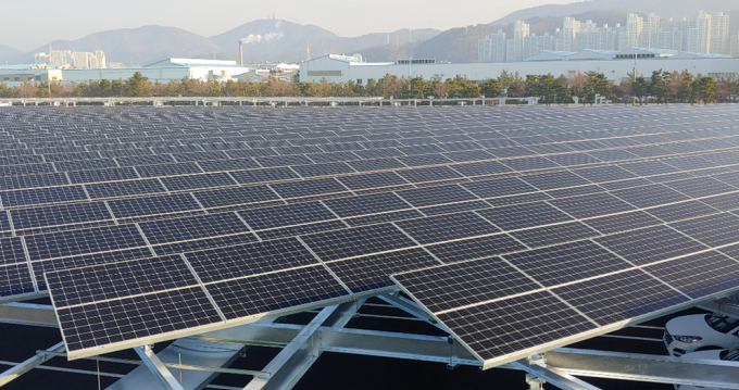 HD현대에너지솔루션이 현대자동차 울산공장에 설치한 9메가와트(MW) 규모 태양광 패널. /사진=HD현대에너지솔루션 제공