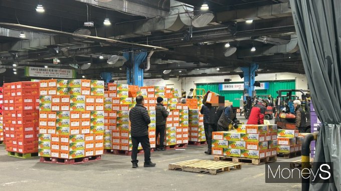 가락시장에서 상인들이 과일상자를 옮기고 있다. /사진=연희진 기자