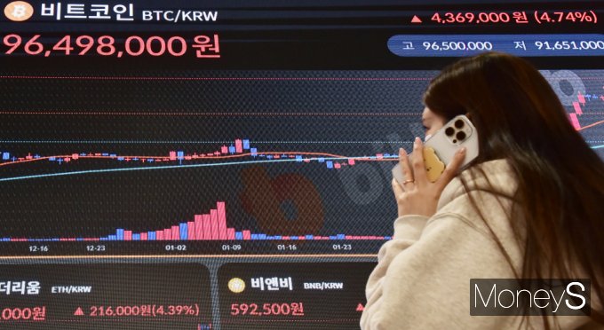 가상화폐 대장주인 비트코인(BTC)이 9500만을 넘어 사상 첫 9600만원을 돌파, 국내외 시장에서 연일 최고가를 갱신하며 상승세를 이어가고 있는 가운데 5일 서울 강남 빗썸 가상자산거래소에서 관계자가 거래현황판을 살펴보고 있다. /사진=임한별 기자
