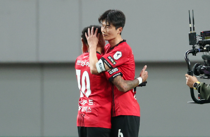 16일 서울 마포구 서울월드컵경기장에서 열린 하나원큐 K리그1 2024 3라운드 FC서울와 제주 유나이티드의 경기, 2대0으로 승리를 거둔 FC서울 제시 린가드와 기성용이 기쁨을 나누고 있다./사진=뉴시스