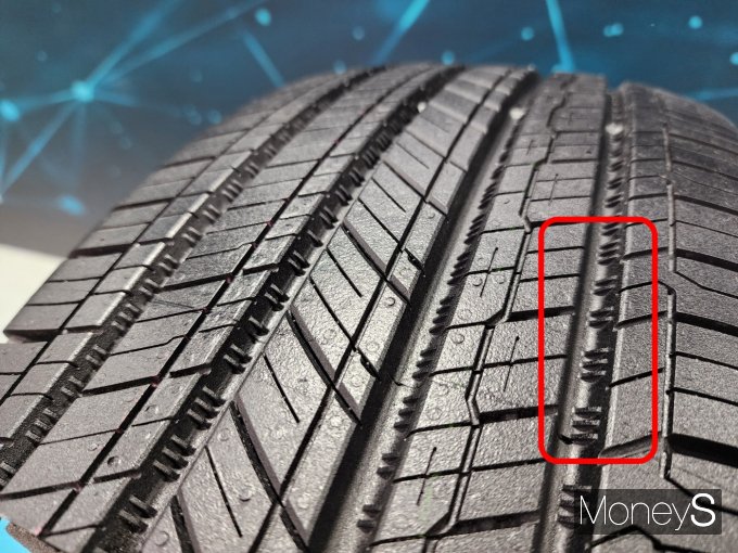 전기차용 타이어는 소음을 줄이기 위한 각종 기술이 집약된다. 금호타이어는 딤플을 추가해 노면 소음을 더 줄였다. 빨간 원 내 구조물. /사진=박찬규 기자