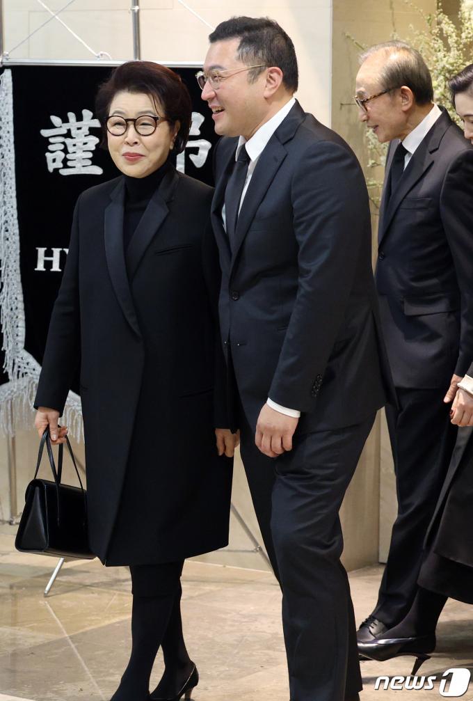 (서울=뉴스1) 박정호 기자 = 이명박 전 대통령이 31일 서울 서대문구 연세 세브란스 장례식장에 마련된 고 조석래 효성그룹 명예회장 빈소를 찾아 조문을 마친 뒤 김윤옥 여사, 아들 이시형 씨가 밖으로 나와 이동하고 있다. 2024.3.31/뉴스1