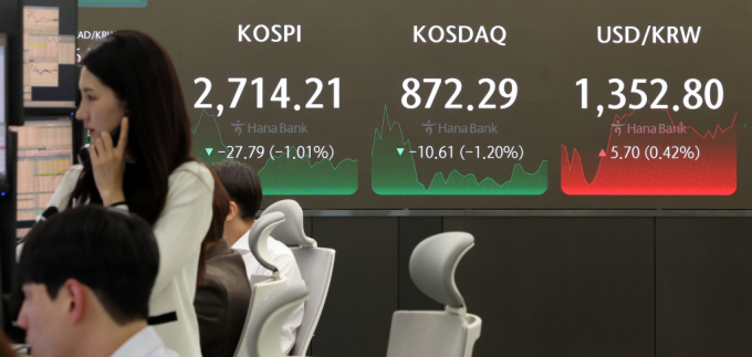 5일 코스피는 전일 대비 1.01%(27.79포인트) 내린 2714.21에 마감했다. 코스닥지수는 10.61포인트(1.20%) 내린 872.29에 거래를 마감했다.
