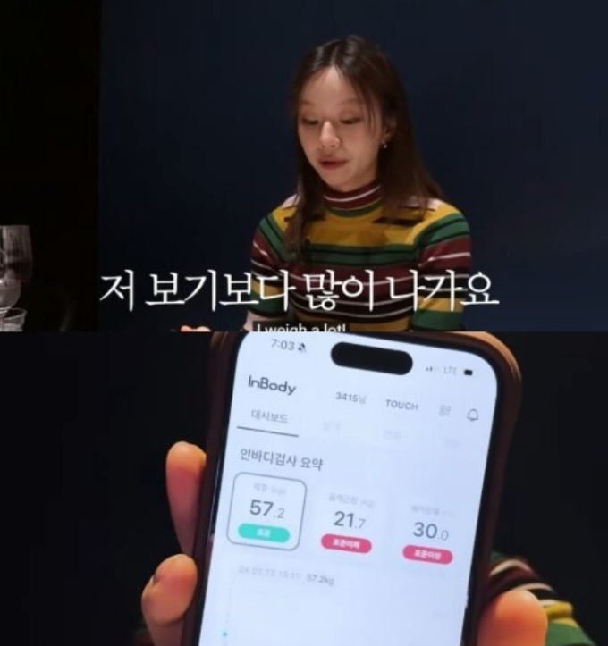 이어 혜리는 "다이어트 처음 했을 때는 57㎏이었다"라며 몸무게 57.2㎏, 골격근량 21.7㎏, 체지방률 30.0%의 검사지를 공개했다.