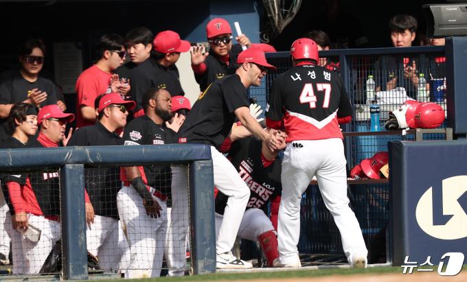 (서울=뉴스1) 김성진 기자 = KIA 나성범이 28일 오후 서울 송파구 잠실야구장에서 열린 프로야구 '2024 신한 SOL Bank KBO리그' KIA 타이거즈와 LG 트윈스의 경기, 7회초 무사 1루 상황에서 볼넷으로 출루한 후 대주자 김호령과 교체되며 더그아웃에서 하이파이브를 하고 있다. 2024.4.28/뉴스1
