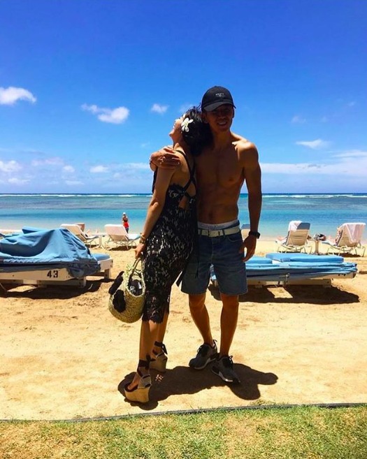 사진 속 션은 구릿빛 피부에 식스팩이 돋보이는 다부진 근육질 몸매를 과시하고 있어 눈길을 끈다. 또 정혜영이 션의 품에 안긴 채 행복한 미소를 짓고 있어 시선을 사로잡는다.