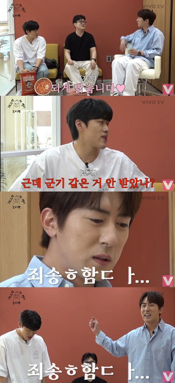 이에 김원훈, 조진세는 막내 시절 '죄송합니다' 자세의 정석을 재연하며 웃음을 자아냈다. 김원훈은 "어느 정도 긴장감이 있어야 녹화할 때 실수를 안 하기 때문에, 긴장감을 만들려고 초반에만 그렇고, 지나면 유하게 풀린다"라고 부연했다.